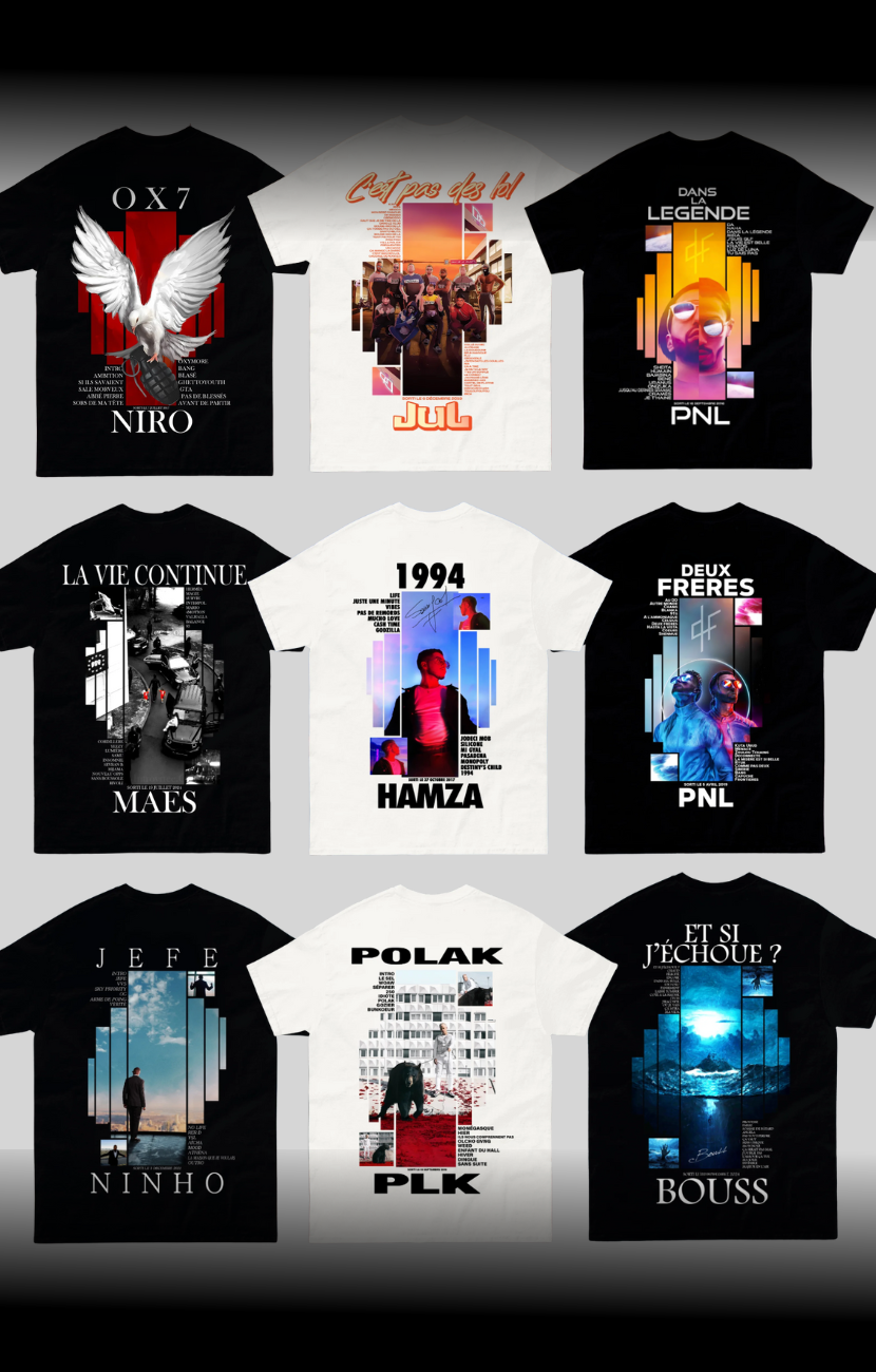 Découvre des t-shirts inspirés par les plus grands — Jul, PNL, Ninho, Niro et plus.